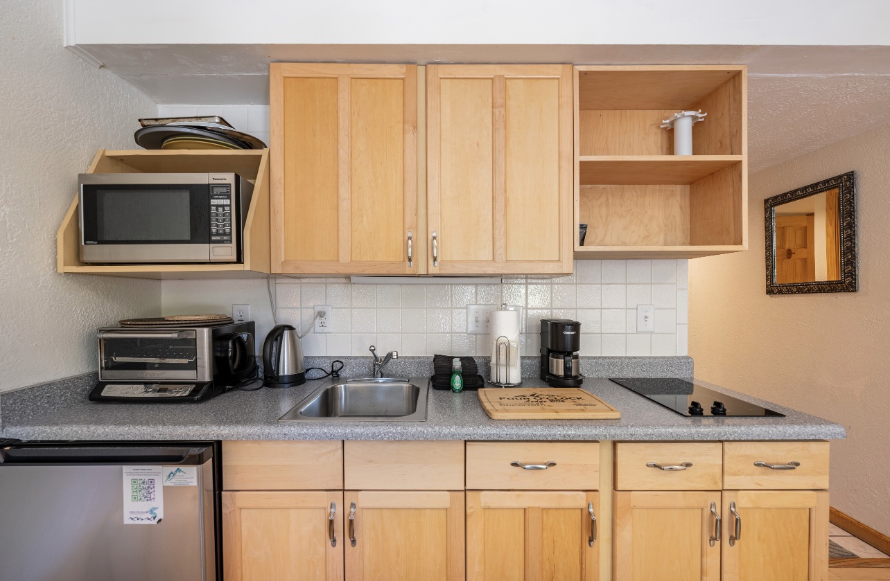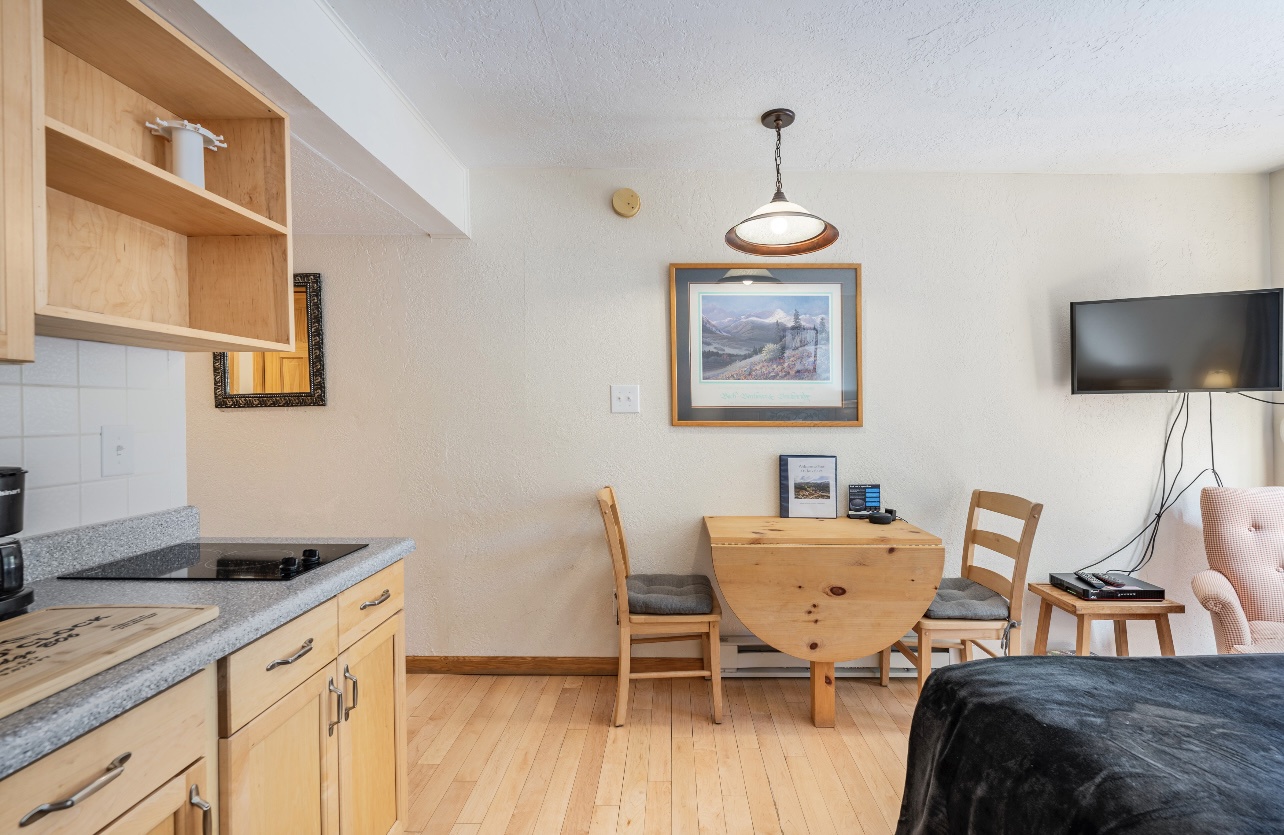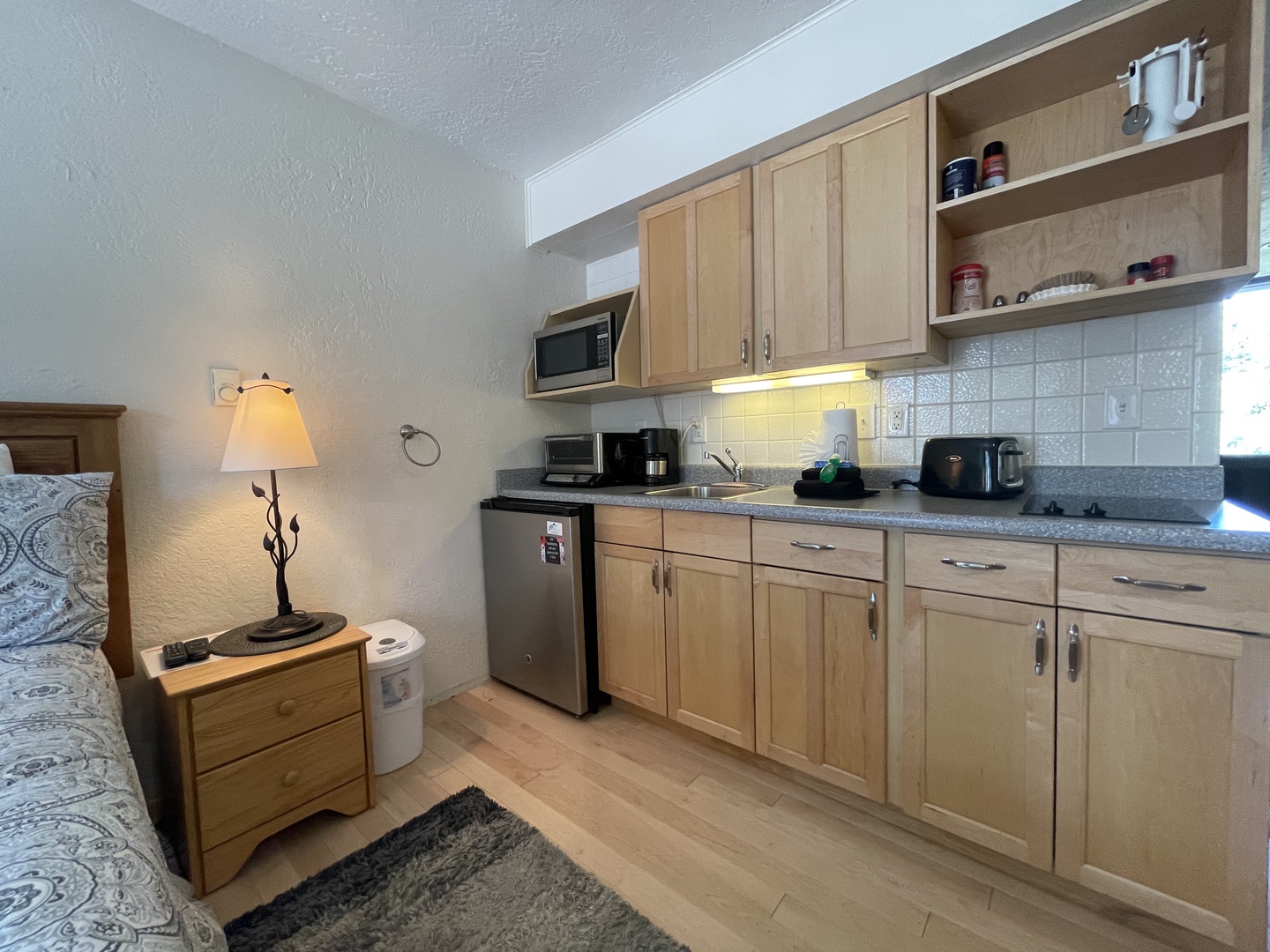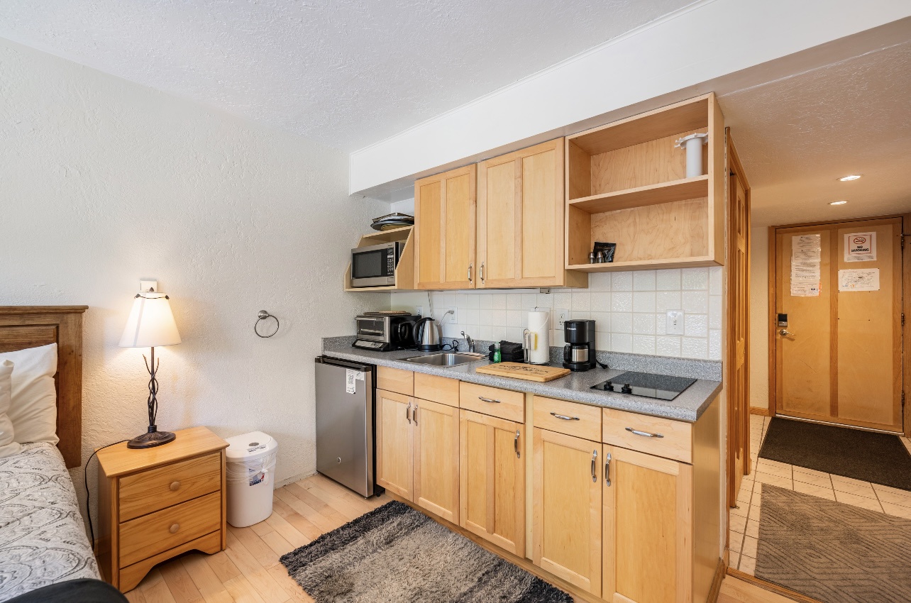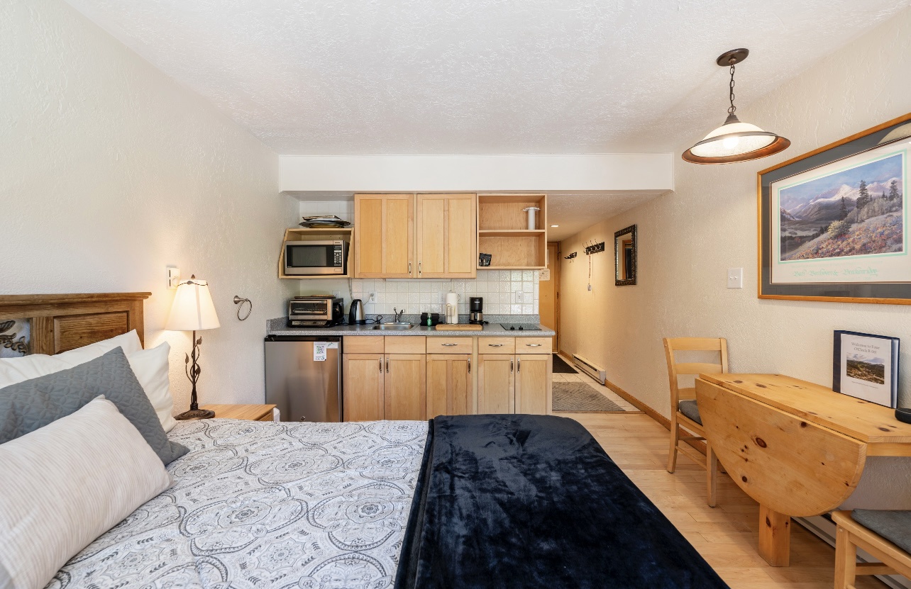 Welcome to Your Cozy Mountain Retreat at Our charming Studio Suite Four O'clock Lodge B06! Discover the perfect spot for a couple's retreat or a solo weekend getaway in our cute and inviting studio suite. Located on Four O'clock Rd., this quiet space features a comfortable queen bed, a bathroom, a breezy balcony and an efficiency kitchen equipped with a coffee maker , fridge, stove top and microwave. Unbeatable Ski Access; Ski right into the complex from the Four O'clock run and enjoy the convenience of the Snowflake lift just steps away across the street. It's a skier's dream come true! Relax and Unwind...After a day on the slopes, relax in the seasonal hot tub and pool at the Upper Village Pool only 5 blocks away from the condo: 2025 Pool Schedule