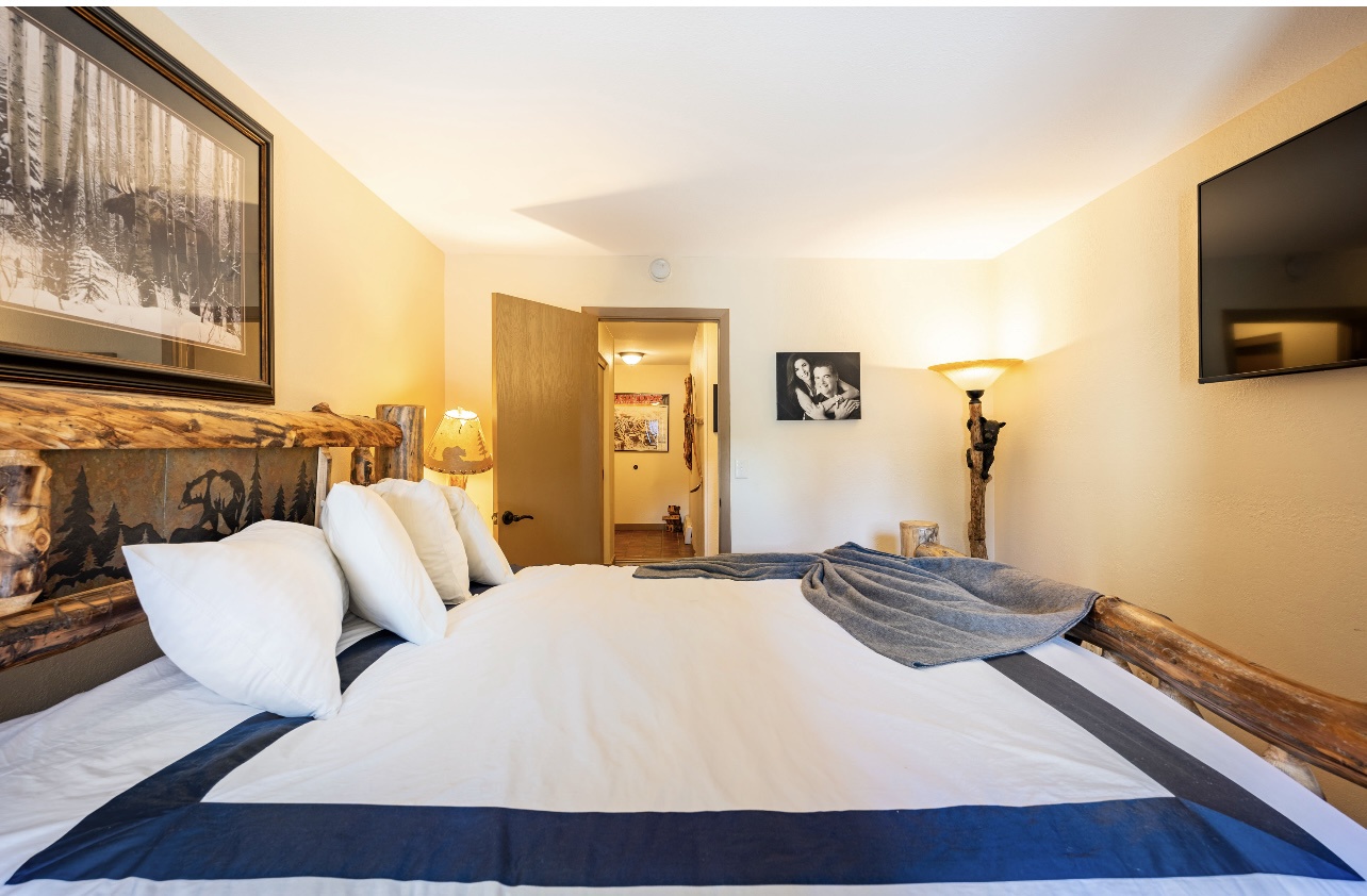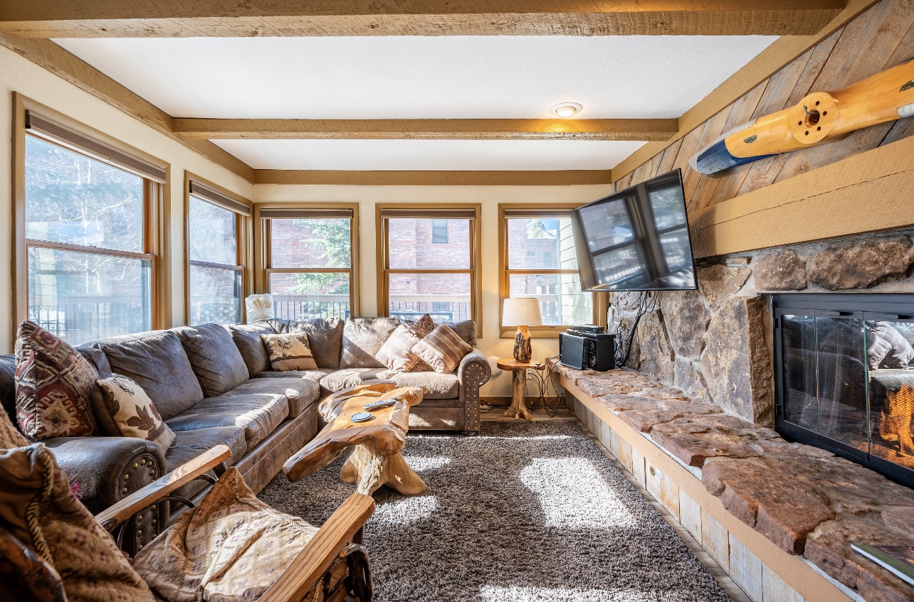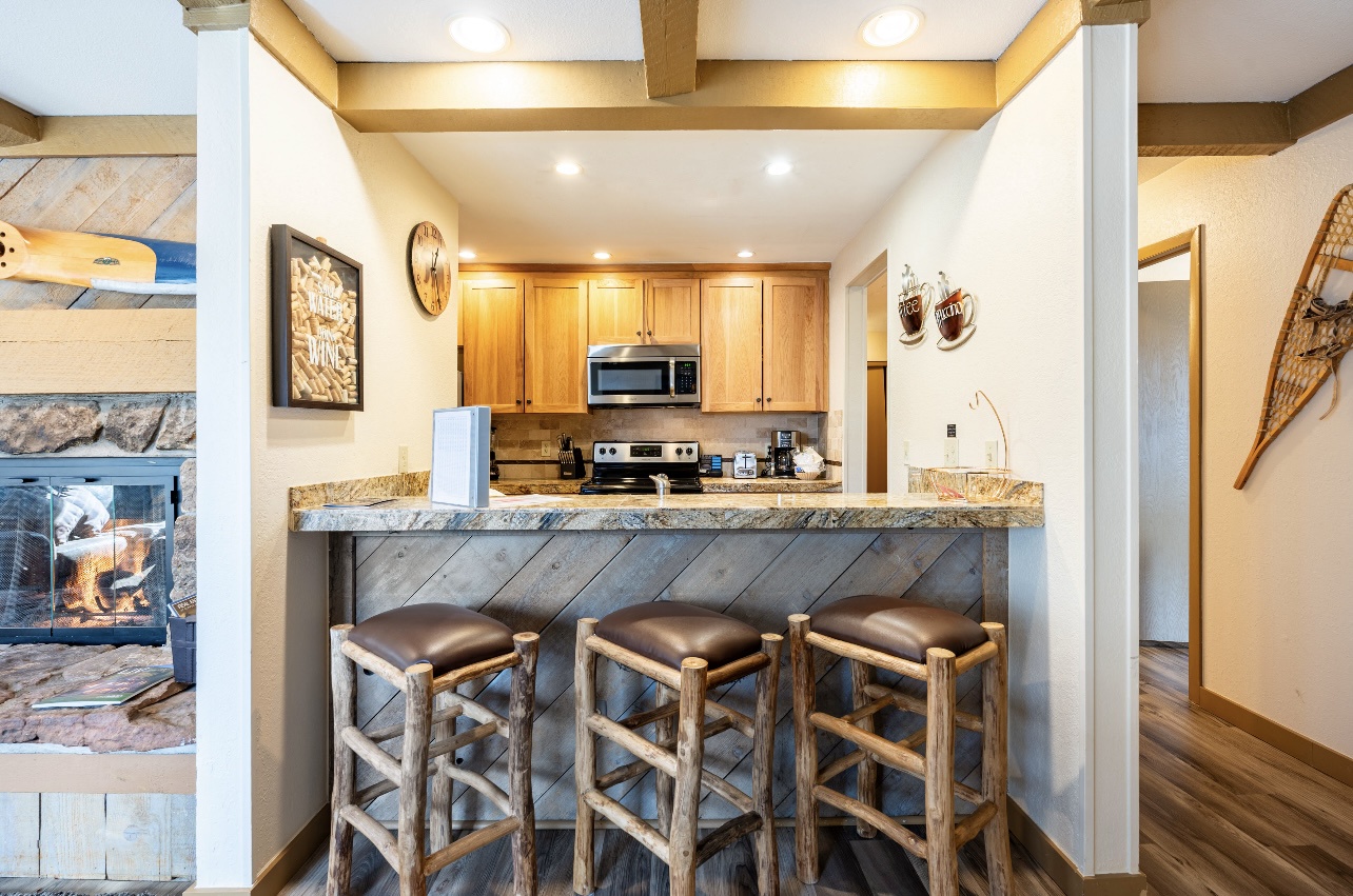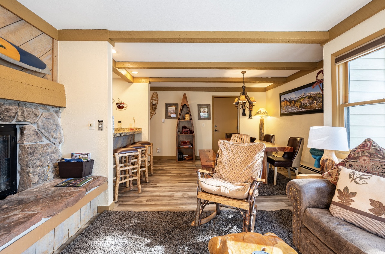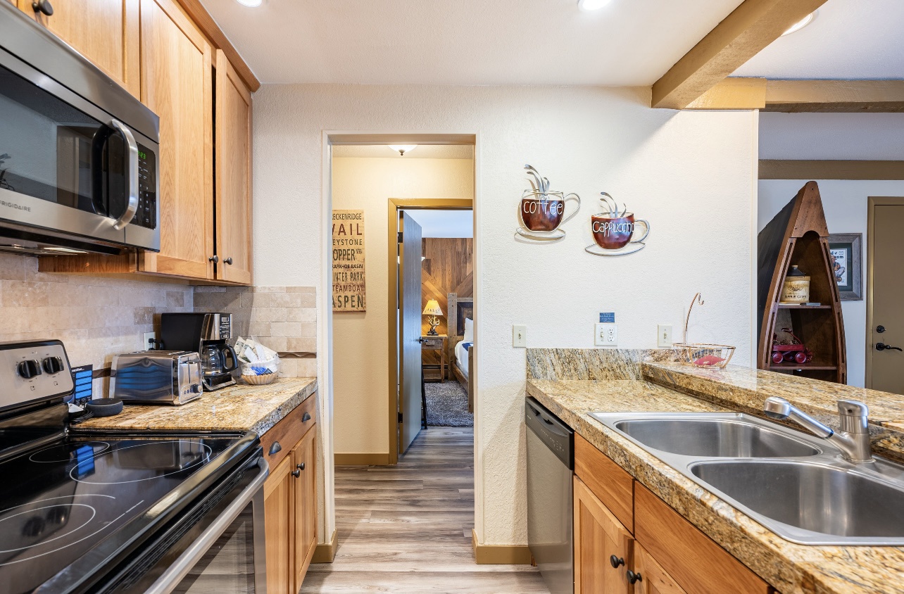 Welcome to LongBranch #111, a charming condo nestled in the heart of Breckenridge's Historic District. This cozy retreat is adorned with rustic mountain decor, immersing you in the authentic Rocky Mountain atmosphere. The condo features two spacious bedrooms, each with a luxurious king bed and an attached bathroom, making it an ideal choice for families or small groups of friends. The modern kitchen boasts stainless steel appliances, elegant countertops, and all the essential cooking utensils, perfect for those who enjoy dining in. Step out onto the expansive balcony to soak up the sunshine and marvel at the breathtaking views of the Ten Mile Range. The clubhouse, open daily from 10am to 10pm, offers an indoor heated pool, large hot tub and a sauna, perfect for relaxation after a day of adventure. Parking is convenient with one designated garage space (note that oversized vehicles will not fit) and an additional outdoor parking spot, accommodating up to two vehicles. For your convenience, coin-operated washers and dryers are available on-site, located off the garage near the south side elevator. Please note, no pets are allowed. Certified service animals are welcome, and support animals can be accommodated with a letter from a doctor or therapist. Be sure to notify the front desk of any service or support animals upon arrival to avoid a $150.00 per day fee plus an extra cleaning charge for unregistered animals. Experience the best of Breckenridge with a stay at LongBranch #111, where comfort and mountain charm await.