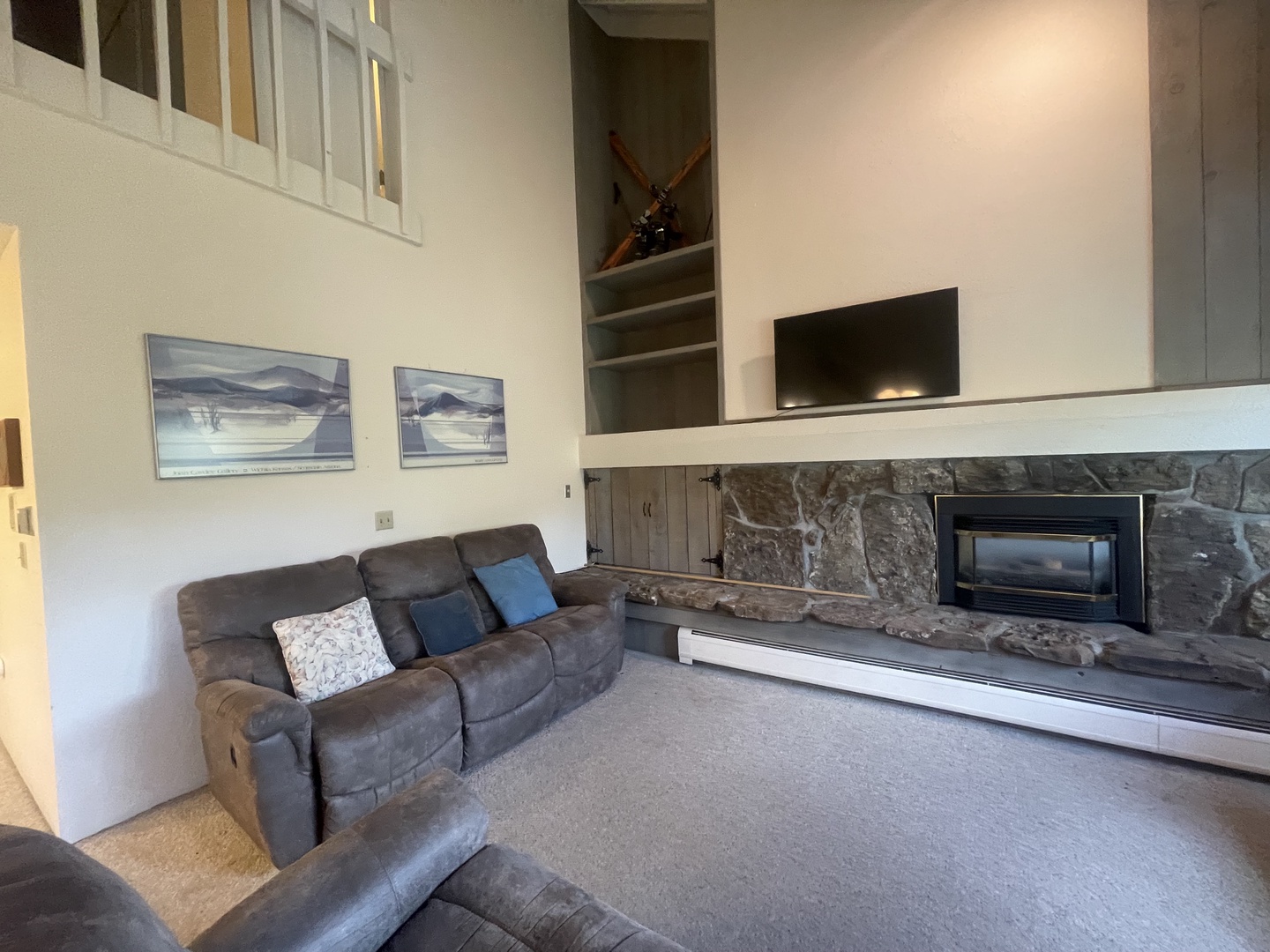 The open-plan living space is adorned with high ceilings and large windows, creating a bright and airy atmosphere. Relax by the stone fireplace or enjoy a movie night on the flat-screen TV. The fully equipped kitchen with ample counter space, makes preparing meals a breeze, while the adjacent dining area provides plenty of room for gathering.